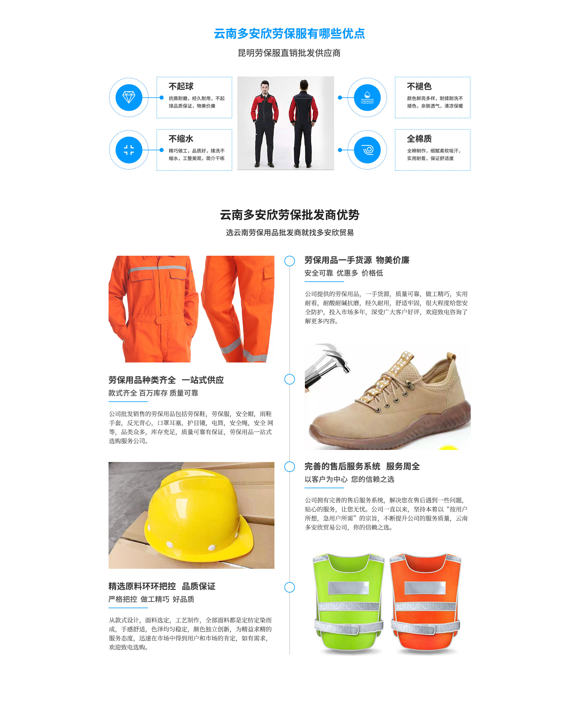 云南多安欣貿(mào)易有限公司位于云南省昆明市官渡區(qū)昌宏路東聚五金建材市場東區(qū)10-10。云南多安欣貿(mào)易有限公司是一家集生產(chǎn)。銷售、批發(fā)為一體的大型勞保用品單位。公司成立18年有余,在這18年里我們憑借我們行業(yè)知識,認(rèn)真的態(tài)度和售后服務(wù),在云南市場迅速崛起,同時代理銷售國內(nèi)外各優(yōu)良廠商(普通、特種)勞動防護用品。安全防護用品,公司現(xiàn)有員工15人,公司一直以來,堅持本著以“按用戶所想,急用戶所需”的宗旨,從款式設(shè)計,面料選定,工藝制作,為精益求精的服務(wù)態(tài)度,迅速在市場中得到用戶和市場的肯定,公司經(jīng)營品種達(dá)到一萬余種,包含了勞保用品的各個系列,如定制工裝、頭部防護,呼吸防護,勞保鞋,電力物資雨衣類眼臉部位防護,3m系列,墜落安全防護,交通安全設(shè)施電筒類多功能防護服、防塵防毒。耐酸堿。耐油,耐高溫,防寒,阻燃,隔熱,氣體監(jiān)測,絕緣防靜電,防砸高空墜落,救護,逃生,等特種勞保用品,如(彩條布,吊帶軟梯噸袋安全帽,...